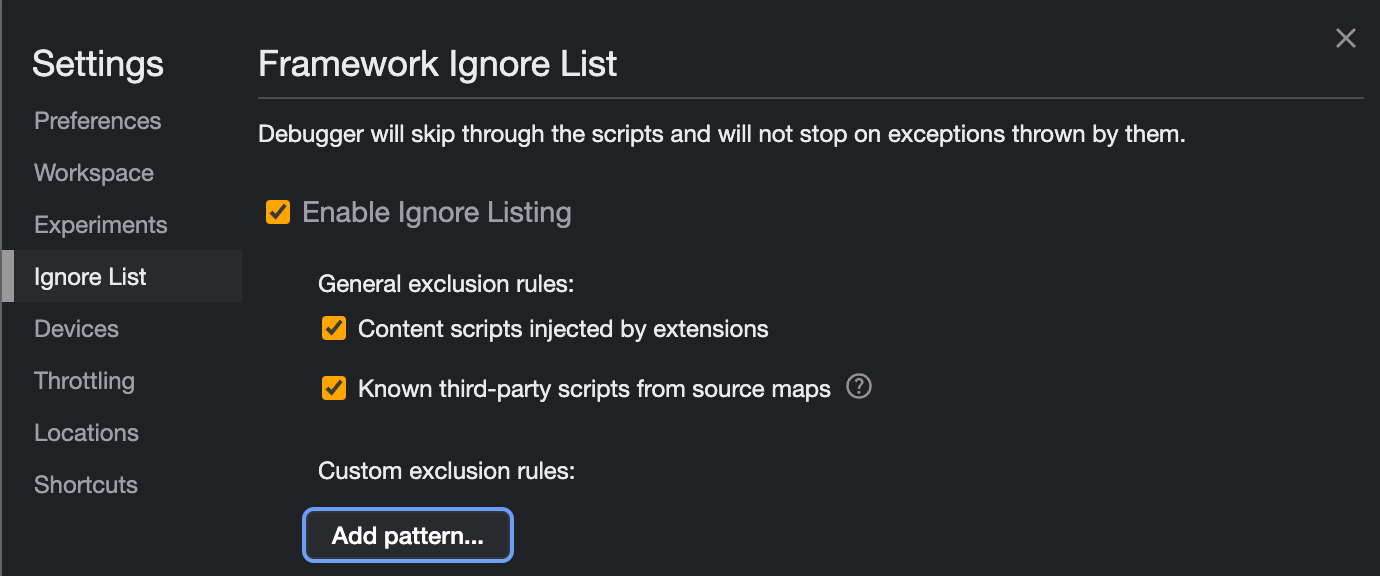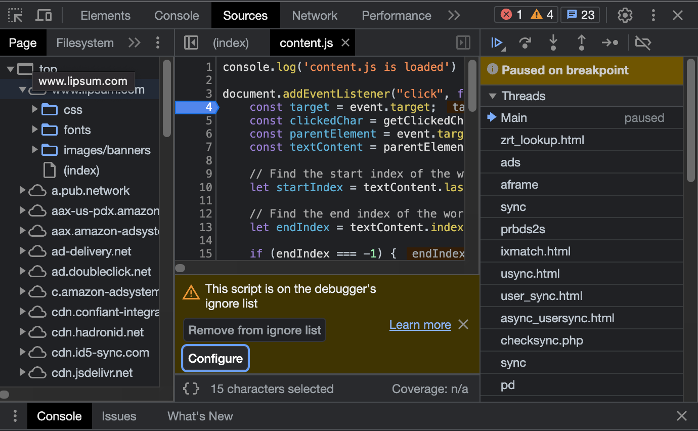This gives you a hook, by clicking content.js, that will now open the Sources panel view of this file and prompt you to either remove from the ignore list or give you an option to Configure the list.