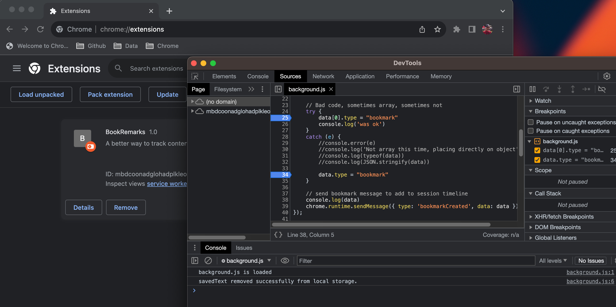 In chrome://extensions, click “Inspect views: service worker” to get debugger for just this script.