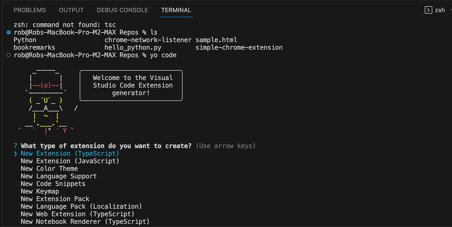 While one could build an extension by hand, even Microsoft has a tutorial that utilizes Yeoman, a tool that builds the scaffolding of many different projects. In our case, we will use it to scaffold the basic framework of our extension for us.