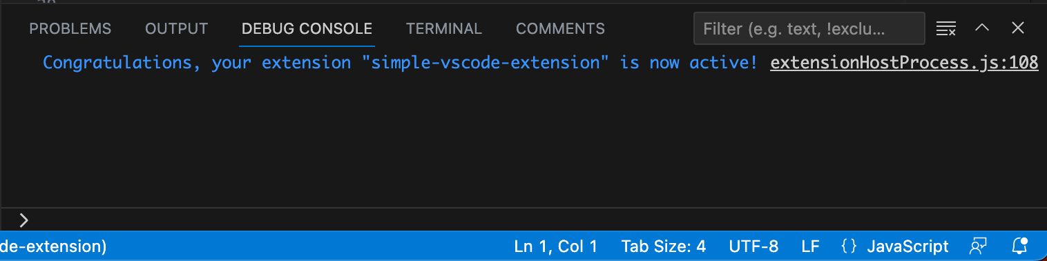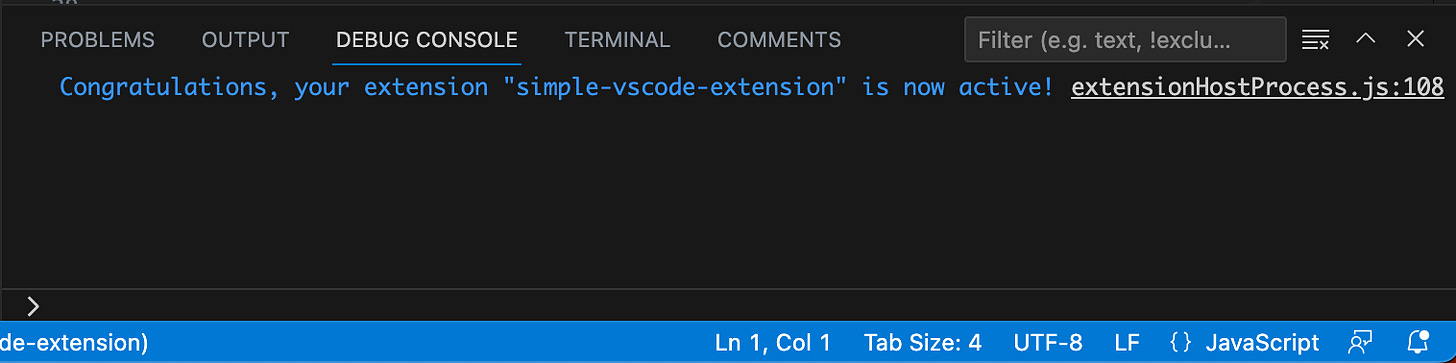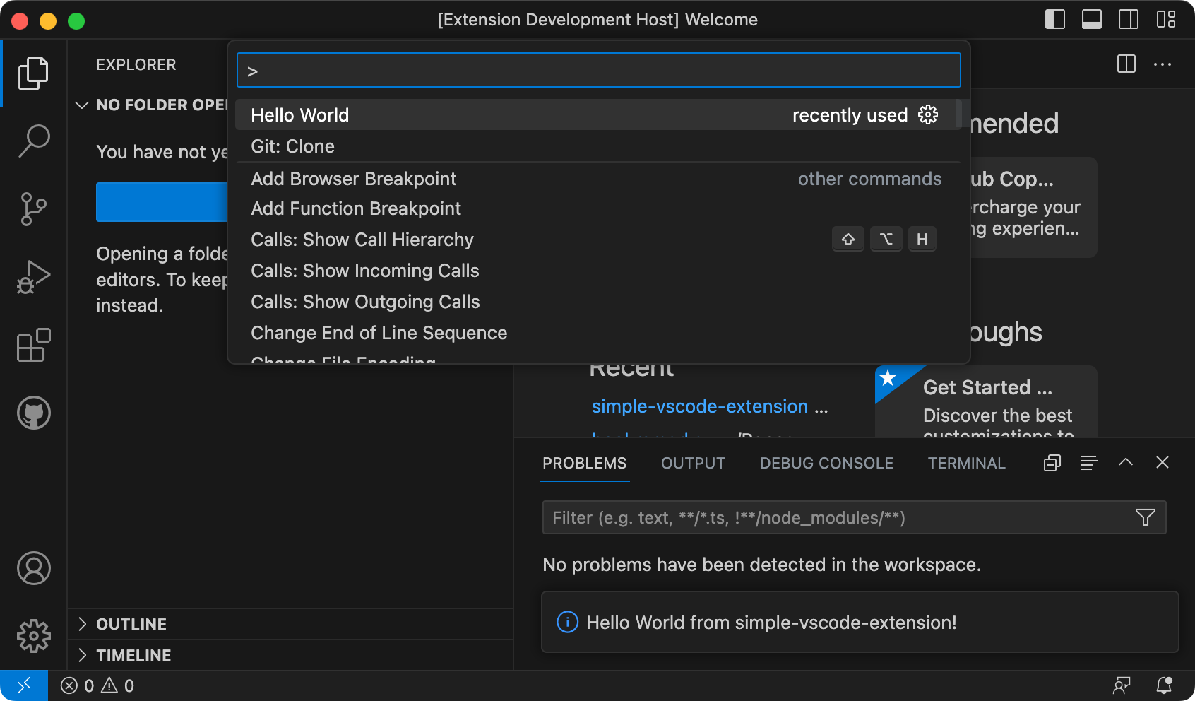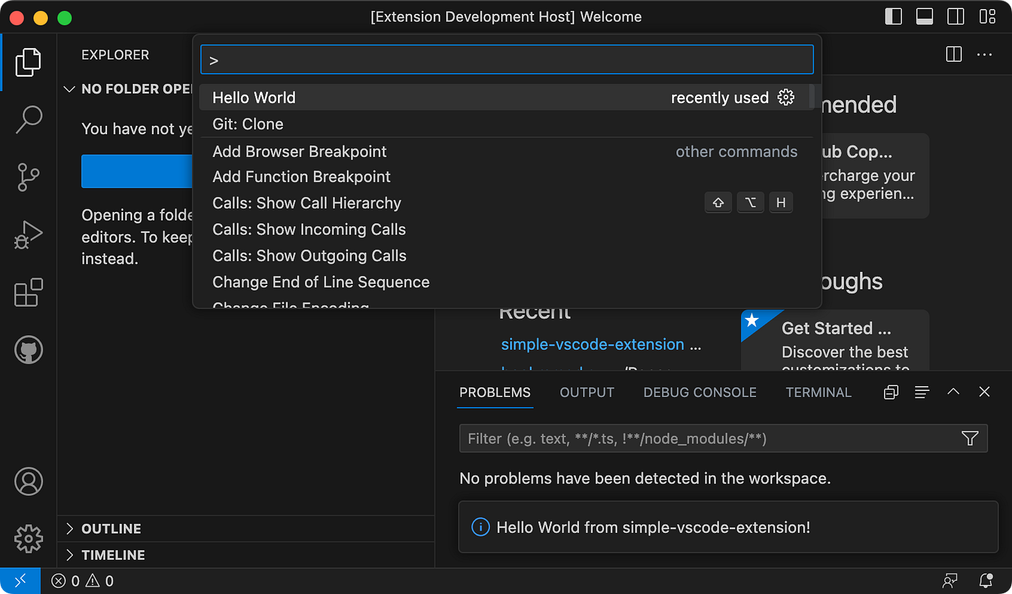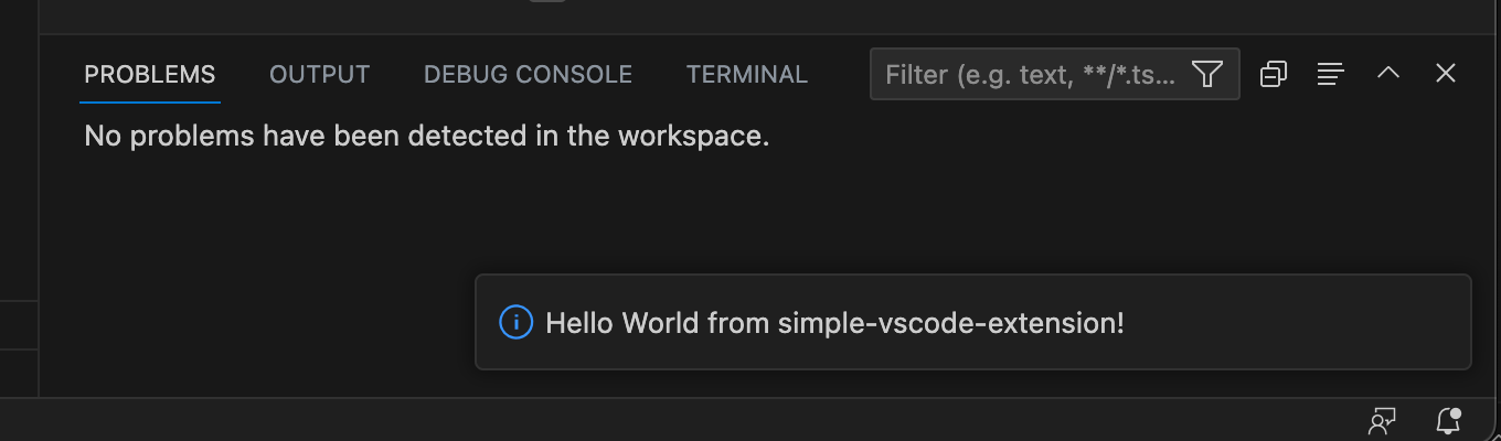 You will see an informational dialog open in the bottom right with "Hello World from simple-vscode-extension!"