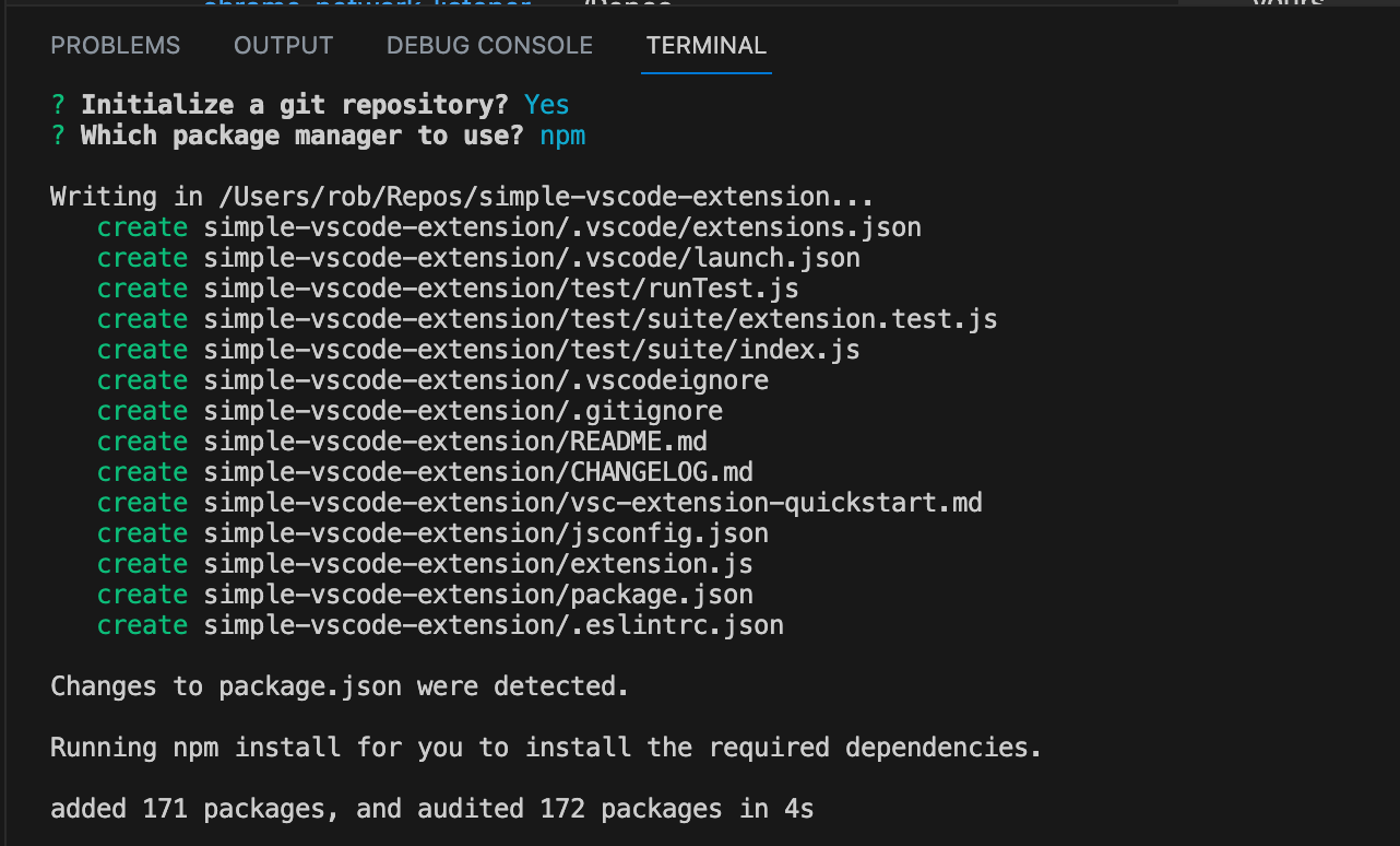 It will now prompt you for a name. I am using simple-vscode-extension for now. Press enter.