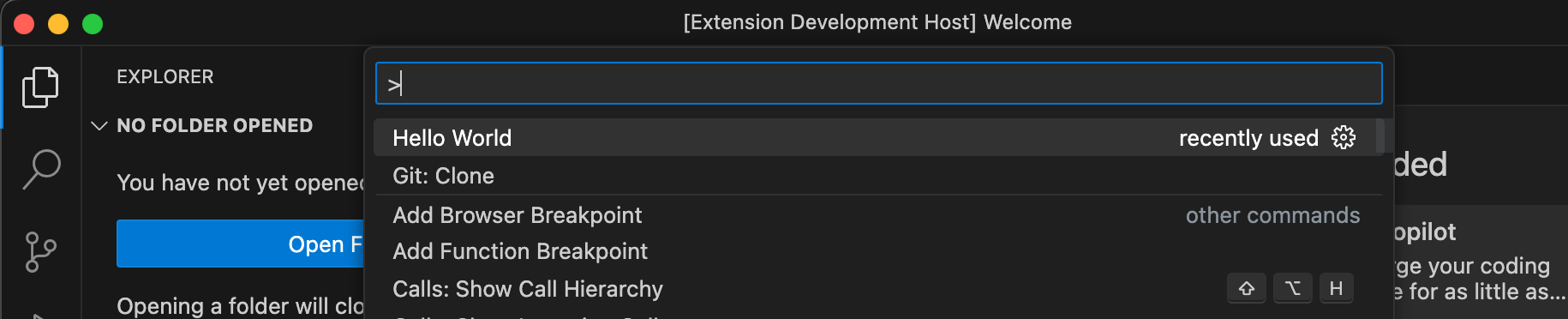 Our auto generated code has given us one command to run, via the VS Code command palette (⇧⌘P), "Hello World". This command (as in the words to type) is configured in the package.json of your extension under "contributes.commands["title"]