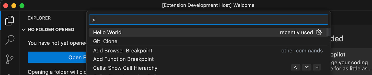 From here, as we only have a source code view of the extension, we need to launch a new VS Code instance with your extension loaded. Simply press F5. What happened?