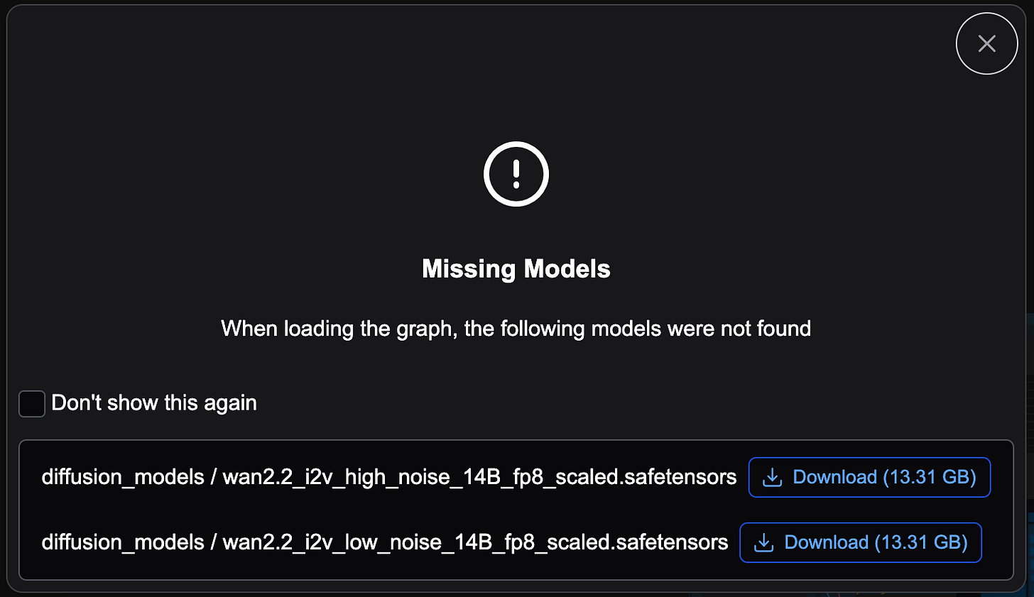 Oops! You mean they didn’t support 30+ GB of models in the download?! Thanks to ComfyUI a super easy fix, just click the Download buttons for each model missing. In this case it’s missing two (as I already had all of them just wanted to show how to address this). However, we will have to find some other models manually to fix the workflow.