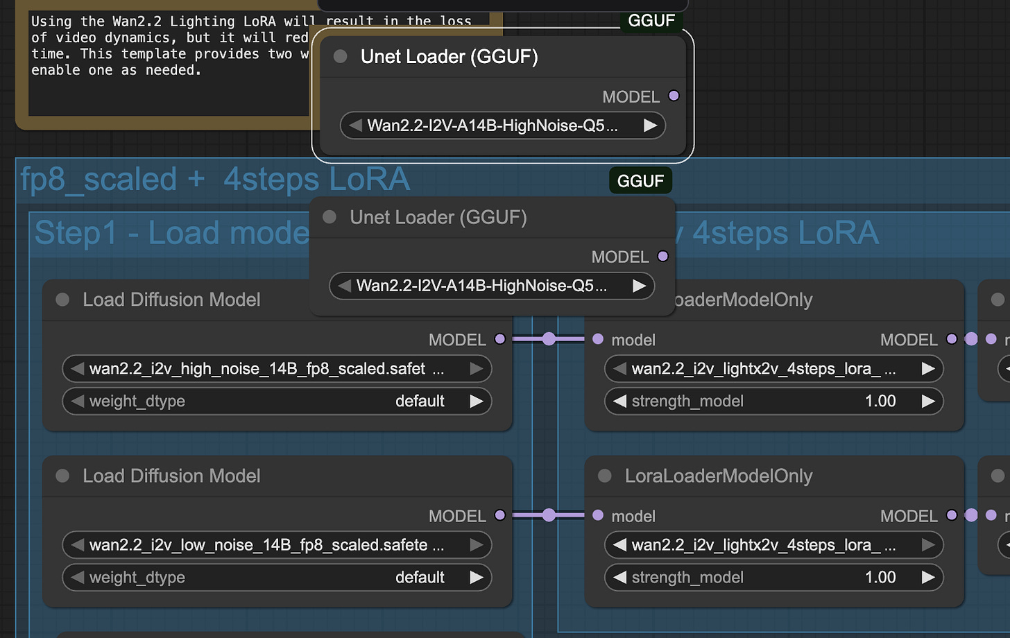 Now that you’ve added the first Unet Loader (GGUF), add a second one to replace both diffusion model nodes.