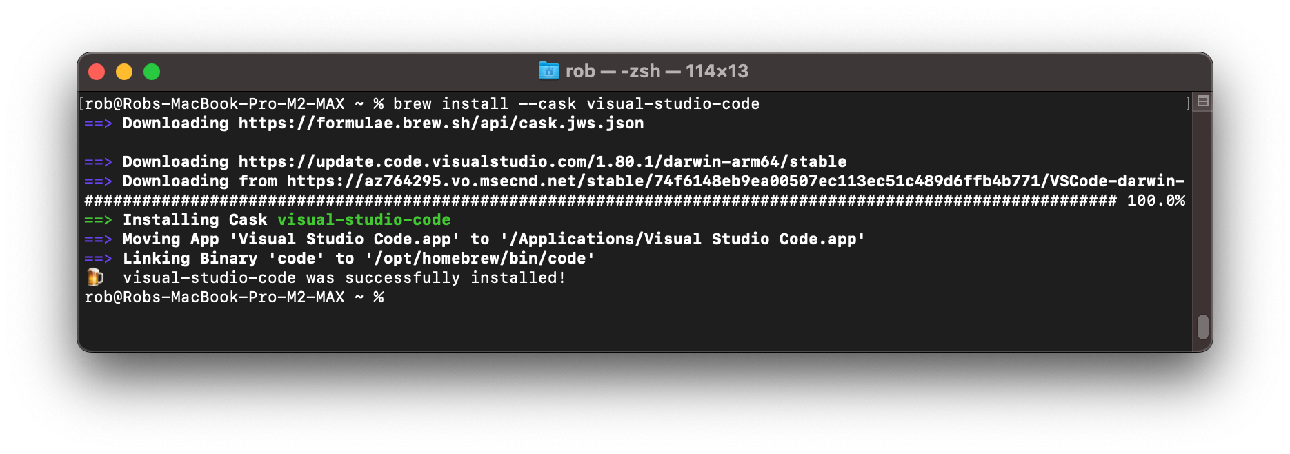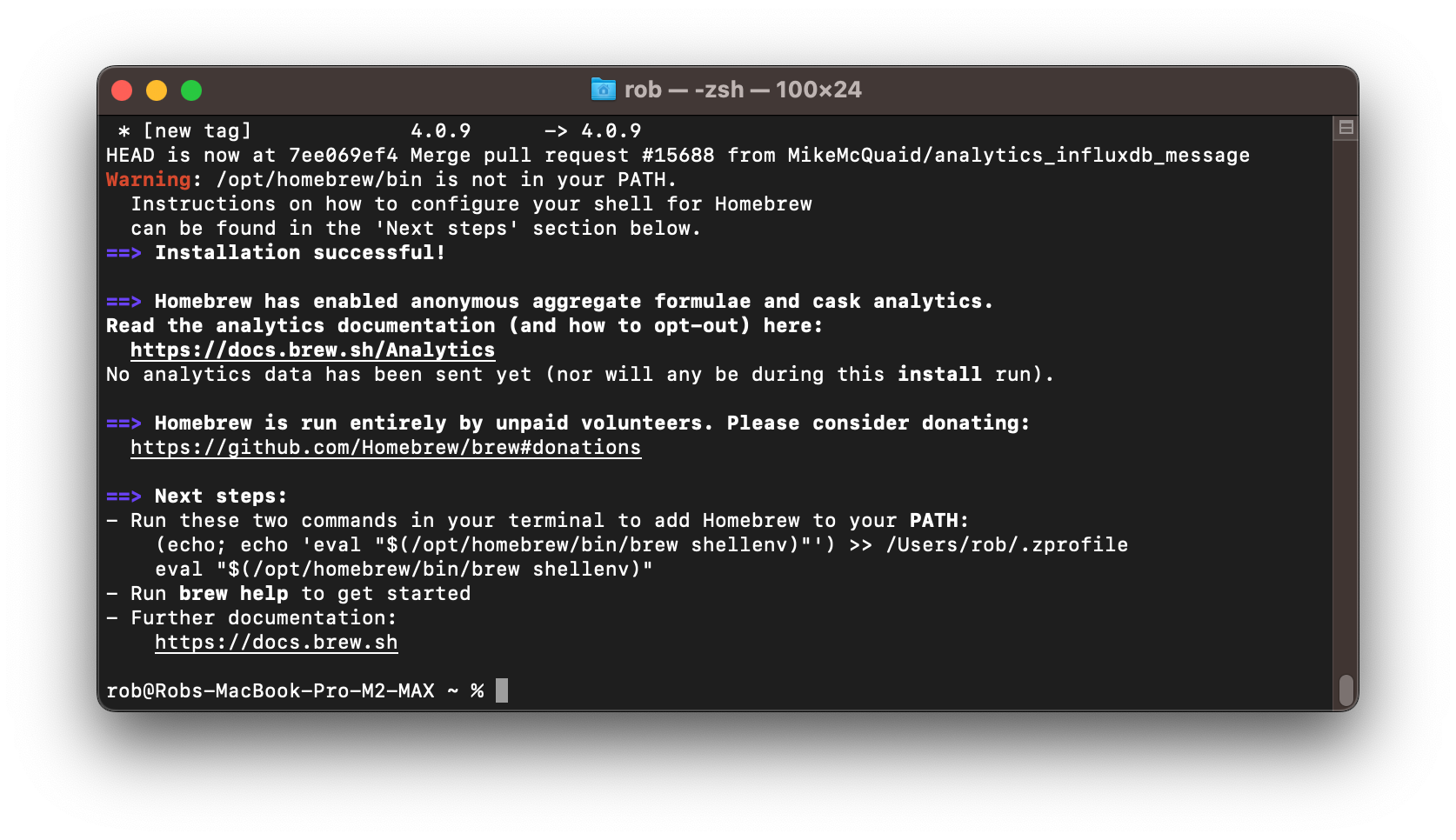 (echo; echo 'eval "$(/opt/homebrew/bin/brew shellenv)"') >> /Users/rob/.zprofile