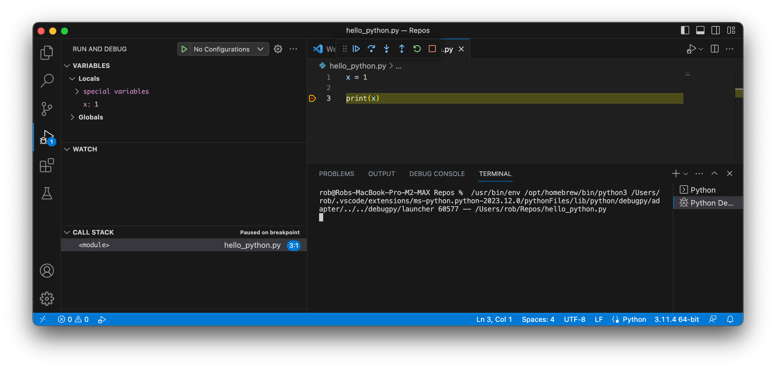 Below is the Visual Studio Code IDE in debug mode, stopped at the breakpoint on line 3. To the left you can see the current value of x before it is printed to the terminal (by pressing continue or step over in the mini toolbar above the code).