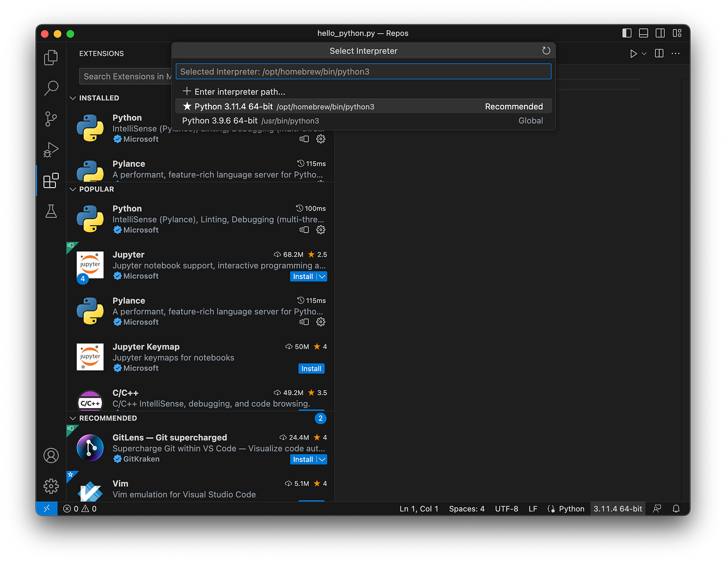Additionally you can now see the the environment has been setup for Python, using the Python3 package you installed earlier via Homebrew by change down in the status bar: