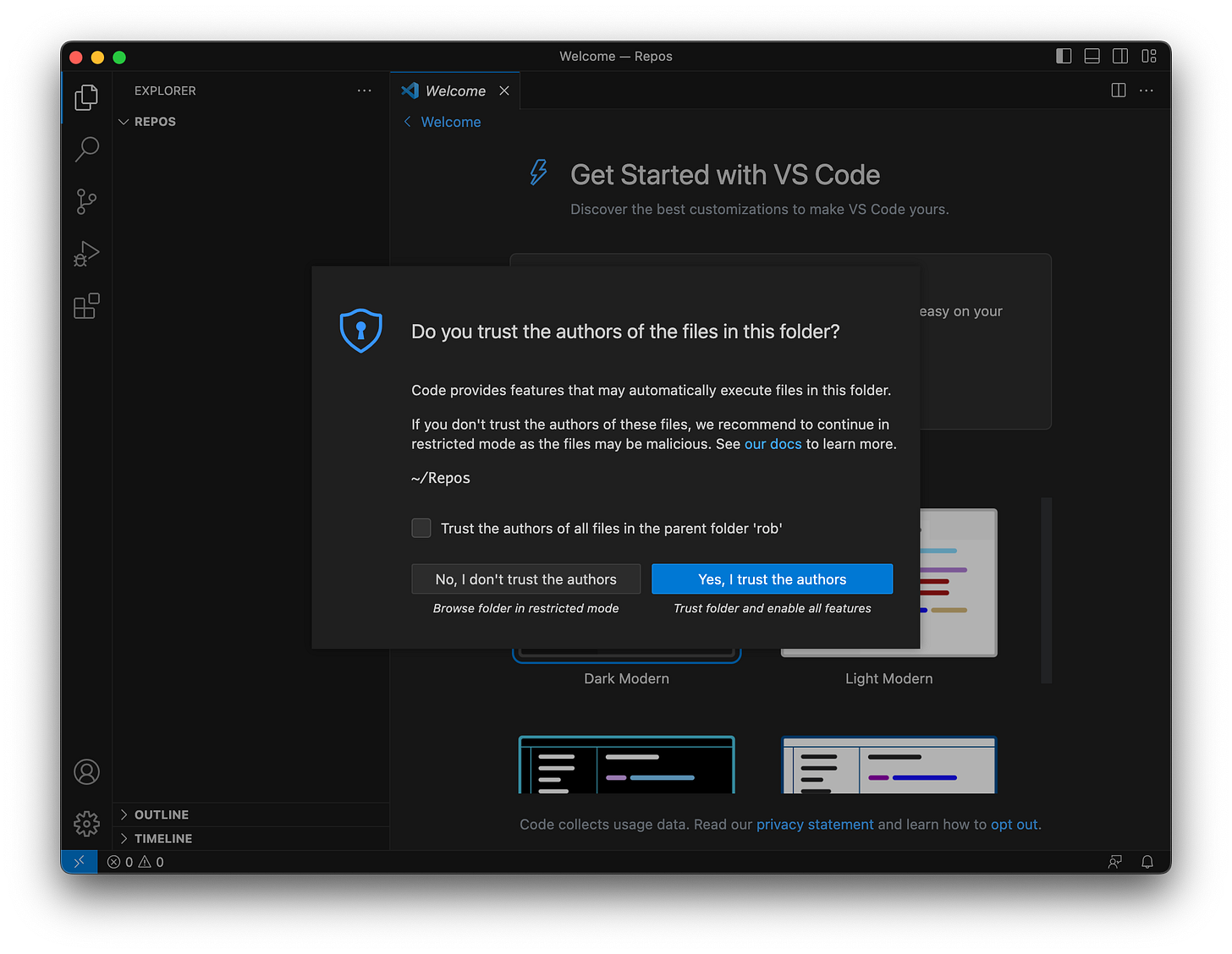 For now we only want to work from ~/Repos and below, so just click “Yes, I trust the authors” because for now, that’s yourself.