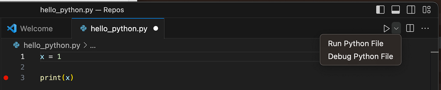 One last thing. In this example we have changed the code to print a variable, x, that has the value of 1. By clicking in the far left of the editor, in the “gutter”, you can click to leave a breakpoint. This in combination with the dropdown option to “Debug Python File”, will allow you to run your script in debug mode, and have its execution stop when that line (line 3 in this case) is reached. When the breakpoint is hit, you can further debug your script and either step or continue its execution.