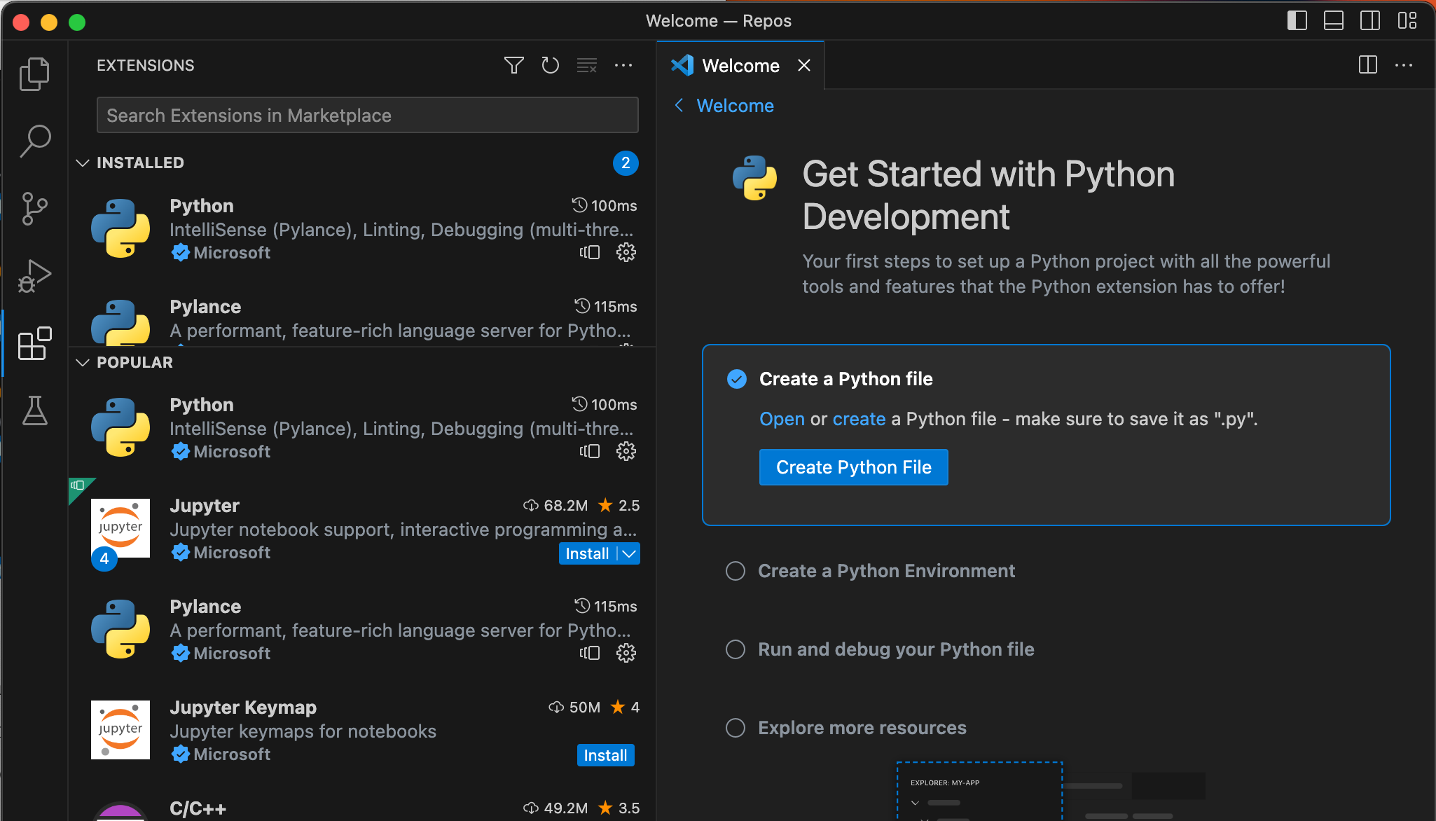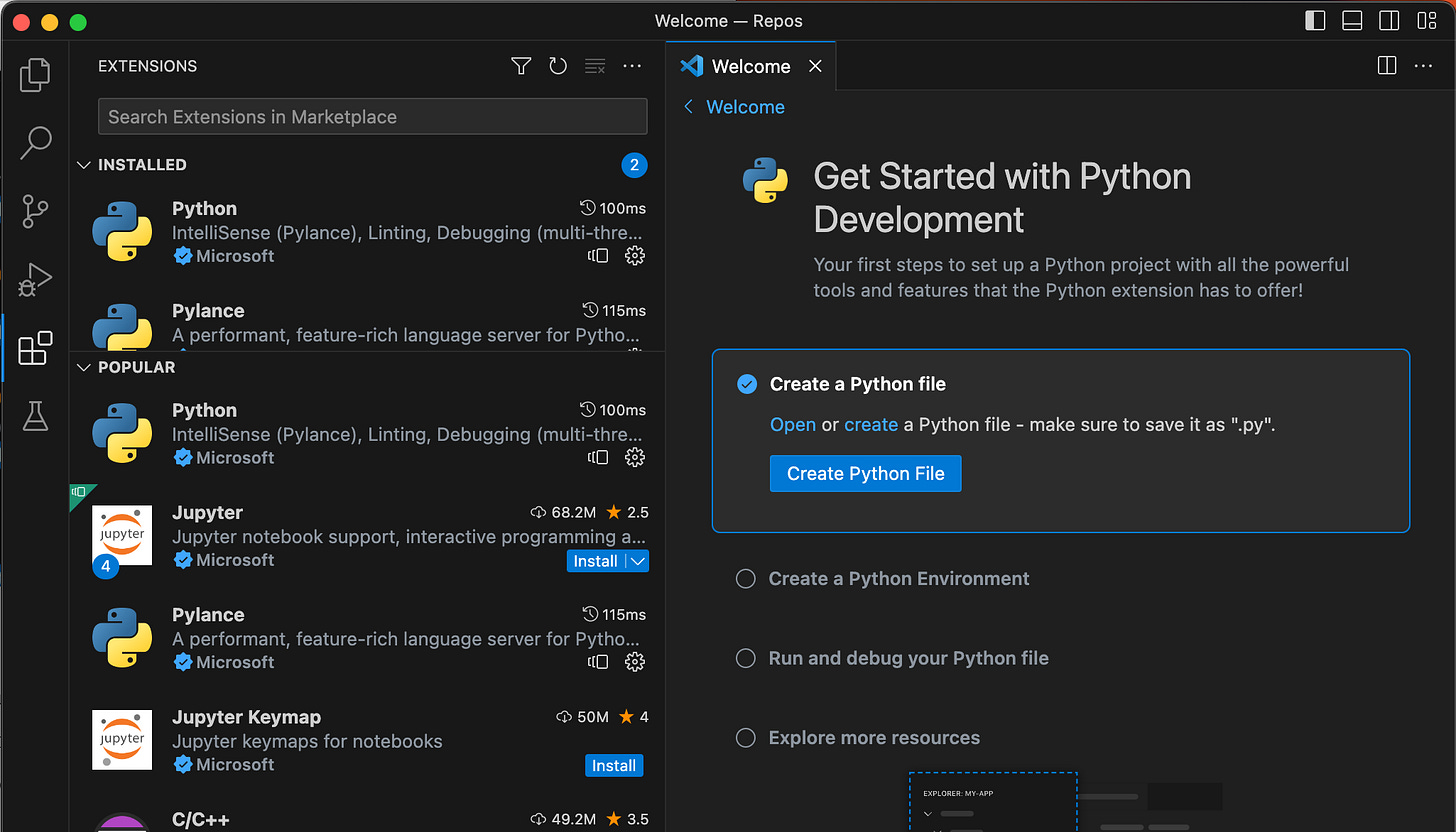 Once clicked, as shown above, the extension will be installed and this Welcome tab will pop-up. Now we can move on to actually creating and running a Python script.