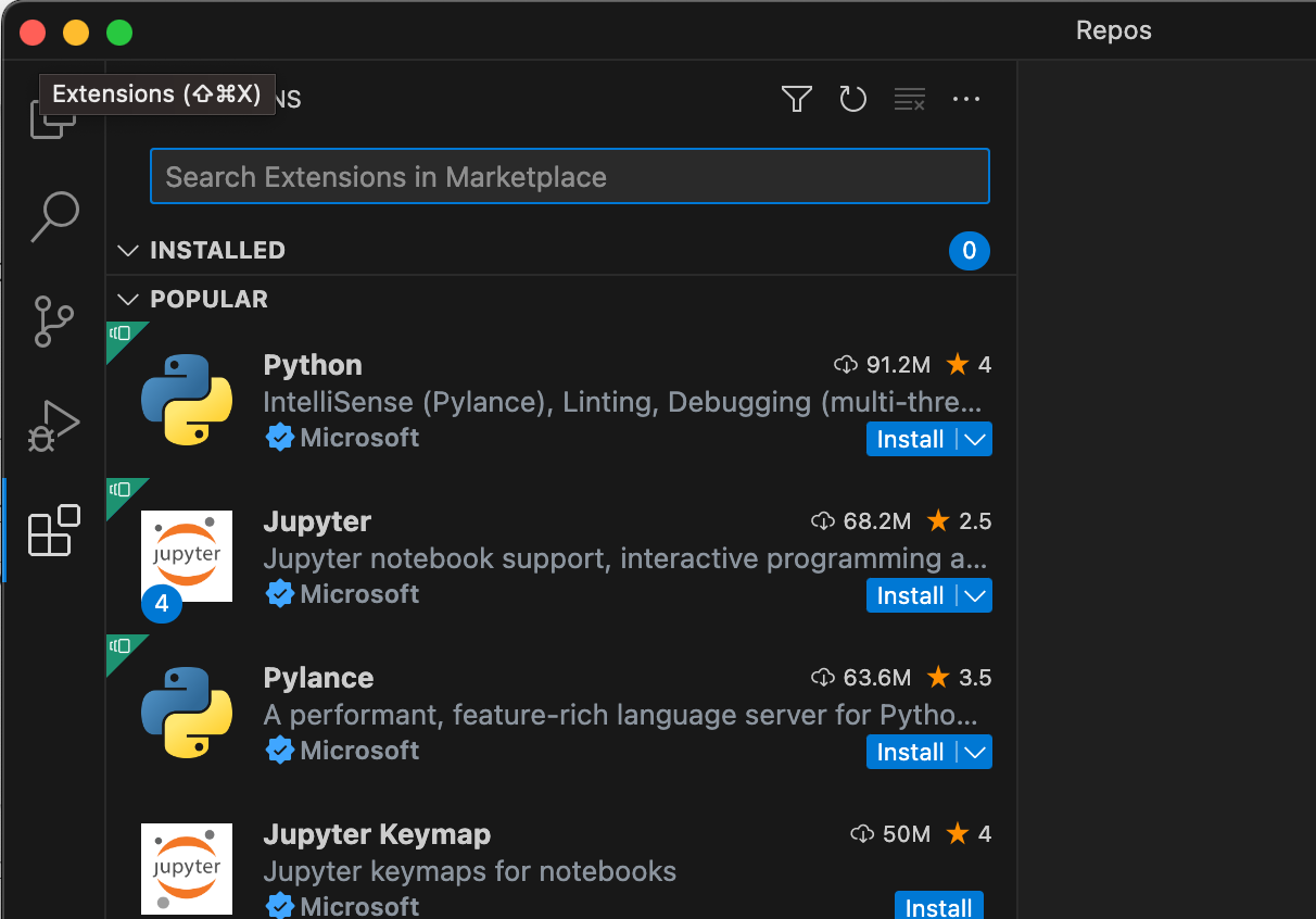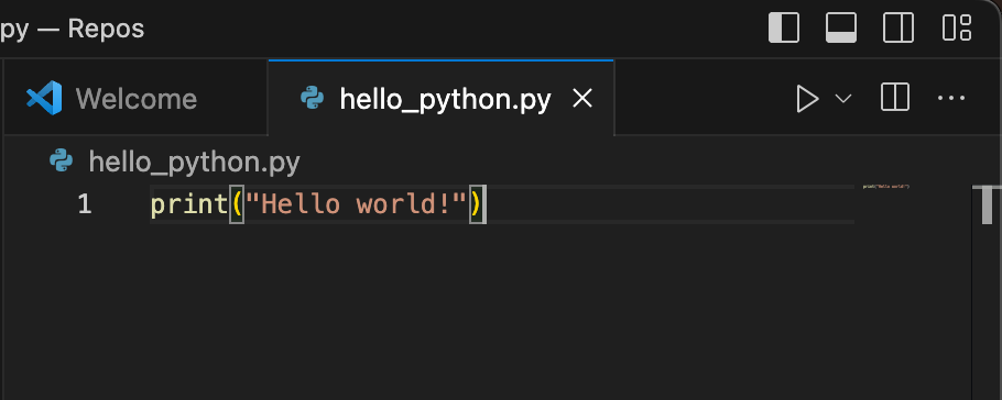 We can create a new Python script a few different ways, but for this tutorial, simply click the “Create Python File”, or if you already closed the Welcome tab, go to File→New File and create a new file named “hello_python.py”. If you chose the “Create Python File” option go ahead and hit command-s and save the file as “hello_python.py” to your Repos directory. The .py extension will be detected by Visual Studio Code and give you the appropriate options via a Python “language server” running behind the scenes.
